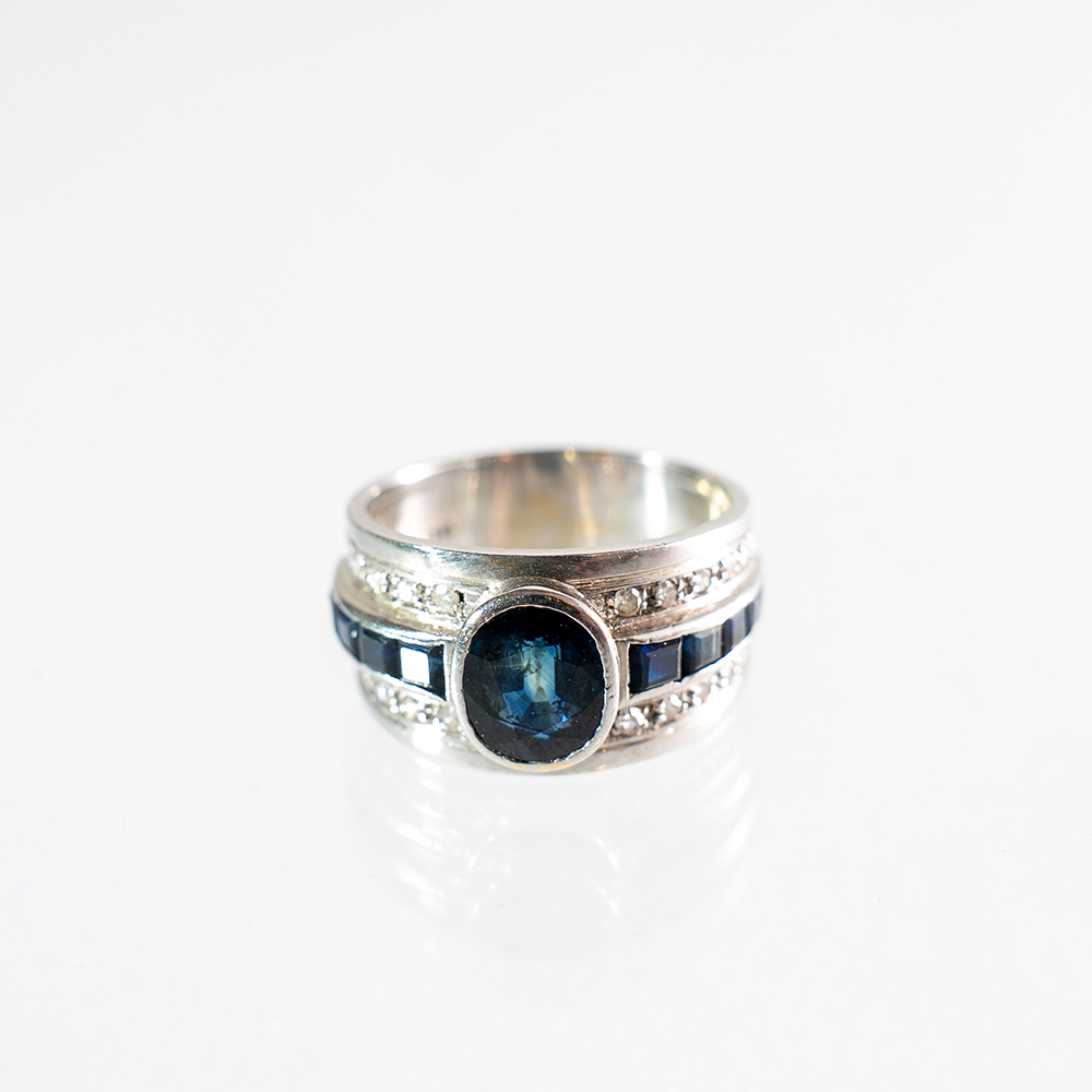 + corindone naturale varietà zaffiro ovale centrale ct. 3,40 + piccoli zaffiri ct. 1,40.