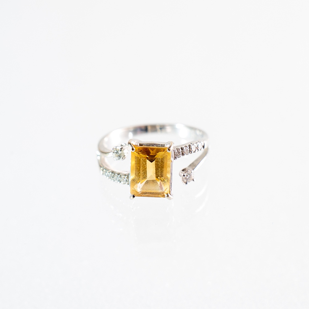 DESCRIZIONE: Anello in oro bianco 18 kt montante piccoli diamanti (ct. 0,22 tot.) + topazio naturale orange ct. 4,20.