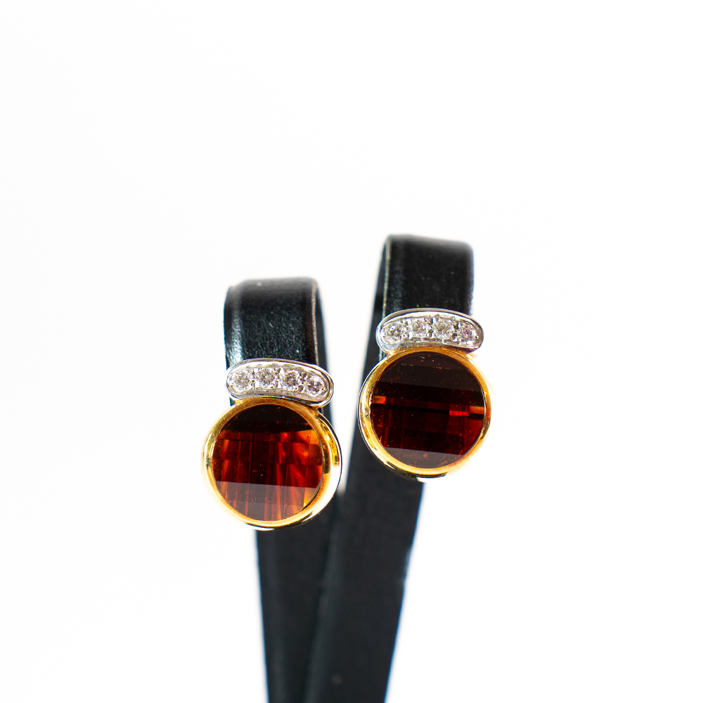 DESCRIZIONE: Orecchini “Pomellato” collezione “Sherazade” in oro giallo 18 kt con tormaline naturali sfaccettate + diamanti (4+4) per tot. ct. 0,40, chiusura perno e clips.
